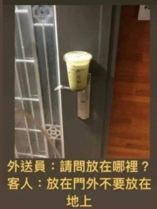 來武漢肺炎(新型冠狀病毒病,COVID-19)疫情升溫,許多人為了防疫偏好點外送。有網友指出,有客人要求外送員將餐點放門外,但不要放地上,卻不擺放置物架或是購買提袋,苦惱的外送員急中生智,把飲料放在大門的「門把」上。不過外送員的做法也引起網友熱議。