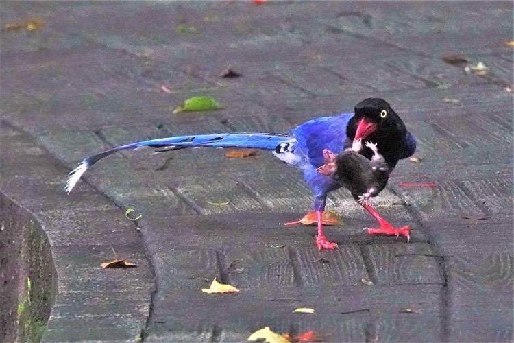 陽明山前山公園偶爾會出現台灣藍鵲蹤跡,王倩儀分享在陽明山前山公園拍攝到的畫面,只見台灣藍鵲兇猛的將台灣鼴鼠撕裂變成食物享用,雖然畫面有些殘忍,卻活生生紀錄了寫實的畫面。
