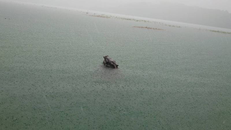 日月潭水位回升,蓄水率來到97.6%,近乎是滿水位的狀態,今水位為748.13公尺,離滿水位748.48公尺又更近了,潭區知名景點九蛙疊像,前幾天還有4隻露出,如今只剩1隻半還在水面上,望向廣闊的潭面,最上頭的小青蛙猶如在汪洋裡探頭,景象相當有趣,這也是歷經嚴重乾旱後,再次出現的難得景象。