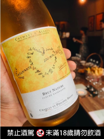 Joshua說,自法國阿爾薩斯小農酒莊Domaine Brand,從酒標到酒體都詩意,被封為瓶裝的詩!最特別的是以傳統「香檳瓶中二次發酵法」釀造,在釀製過程,加入隔年同塊地的葡萄汁,再度發酵,形成花香、果香交織,是滋味典雅氣泡酒。