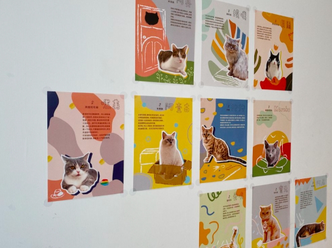 牆上貼有9隻貓咪的姓名與個性介紹,千萬別踩到主子的地雷,可是會讓牠不爽的揮出貓貓拳喔!