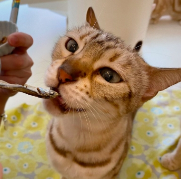 「抱抱」是隻美麗的豹貓,來到這時已經是成貓了,對待人時沒辦法控制力道,若他已經「出嘴」了,收手的速度可要快一些。