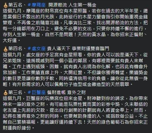 來到九月時,巨蟹座的玩樂宮迎來金星,代表財神駕到,將為巨蟹帶來一筆意外之財,有可能是過去買的彩券中獎,或是久未連絡的老友還清過去欠下的債務等,另外也停醒巨蟹座,獲得意外之財同時也要記得多幫助身旁的人,或捐款做公益,讓自己累積福報。