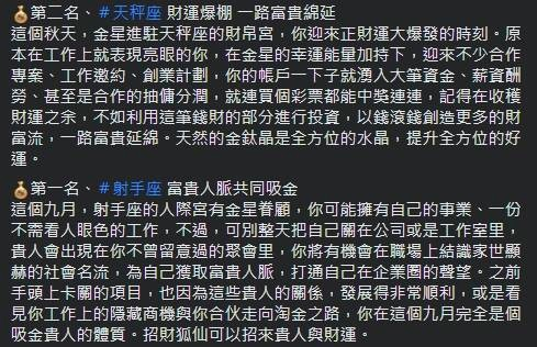 射手座在九月時因人際宮有金星眷顧,使射手座能擁有一份無需看人眼色的工作,不過提醒因有許多貴人會出現在聚會中,所以別將自己整天關在辦公室,而也因為那些貴人的關係,射手事業發展將會非常順利,前途一片光明,可說是九月最強吸金體質。