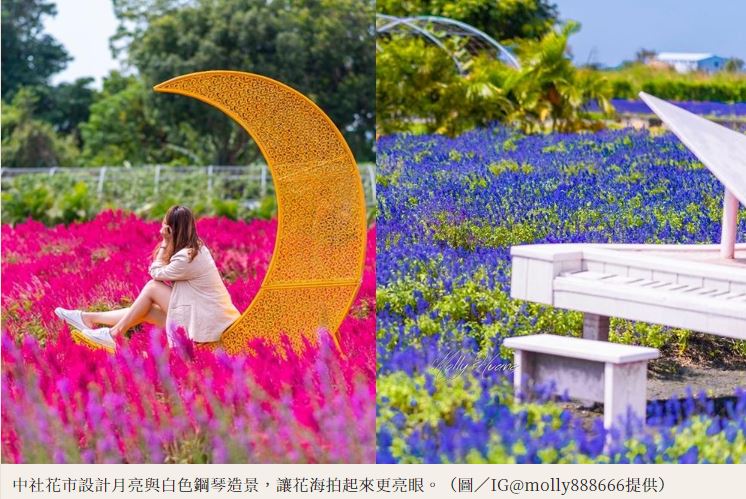 台中后里的「中社觀光花市」是中台灣大規模的賞花熱點之一,佔地廣達6公頃的園區,四季都有不同品種的花卉輪流綻放,而初秋之際正值火焰雞冠花最美時刻,整片紅豔豔的景色在網路上迅速爆紅,被網友譽為跟日韓的「紅色掃帚草」一樣美,密集盛開的花海搭配月亮、白色鋼琴一起入鏡,也營造如MV般的浪漫場景!
