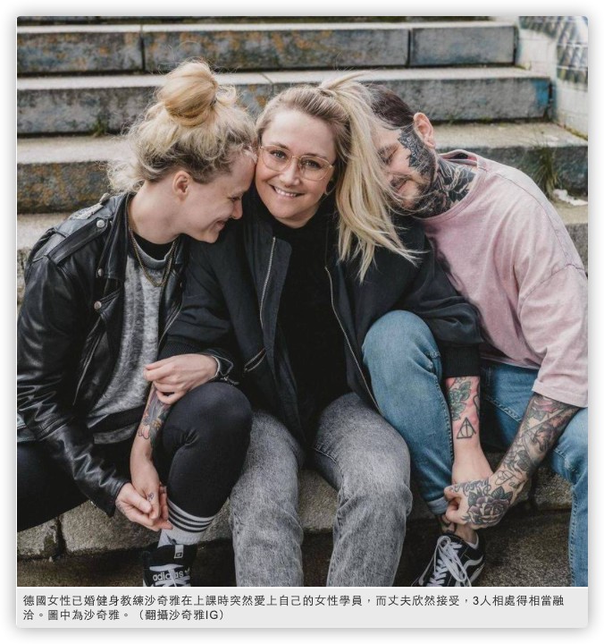 根據《鏡報》報導,德國漢堡28歲健身教練沙奇雅(Saskia Michalki)在2019年突然愛上自己的29歲學員呂伊(Lui),呂伊也回應了這段感情,但沙奇雅早在2016年就與34歲馬爾辛(Marcin)成婚,沙奇雅選擇向丈夫坦承,但也強調自己同時無法捨棄對馬爾辛的愛,「我仍像剛開始那樣地愛著他,我不想失去他」。