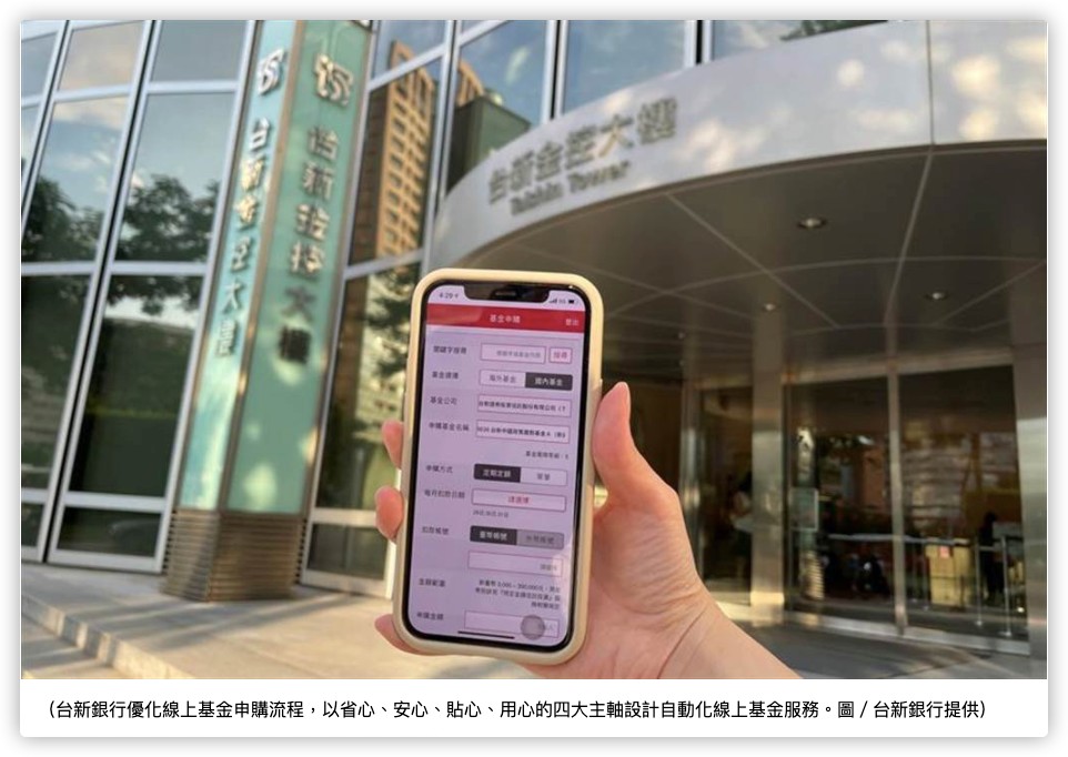 台新銀行執行副總經理黃培直表示,在疫情影響下,凸顯線上投資平台的便利與重要性,這次線上基金申購流程的多項創新,皆以客戶體驗為優先,進行多次深度訪談,四大主軸為省心、安心、貼心、用心,設計自動化線上基金服務。