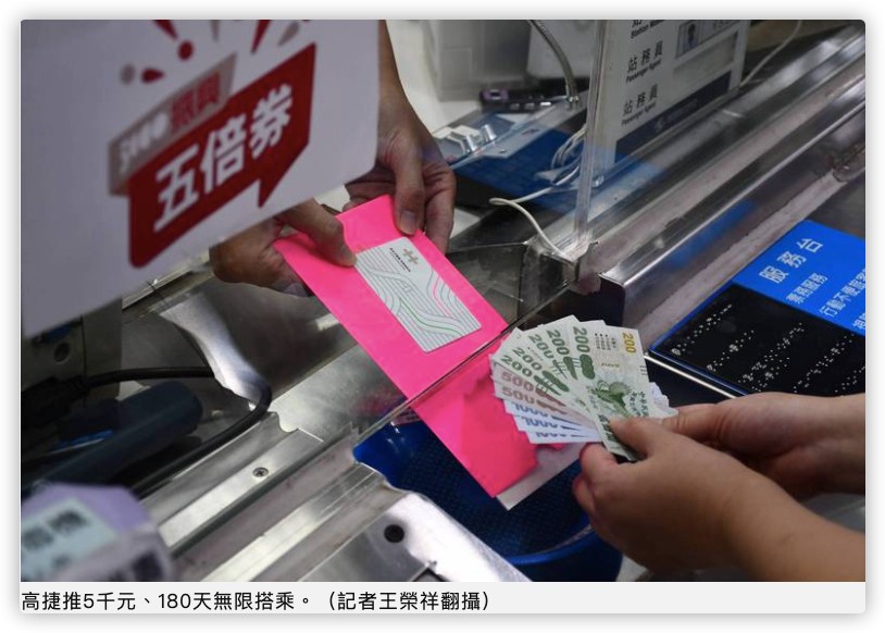 五倍卷商機多,高雄捷運不放過,今宣布率全國捷運同業之先,推出5千元「180天無限搭乘」方案,可全用五倍券、也可搭配現金購買。