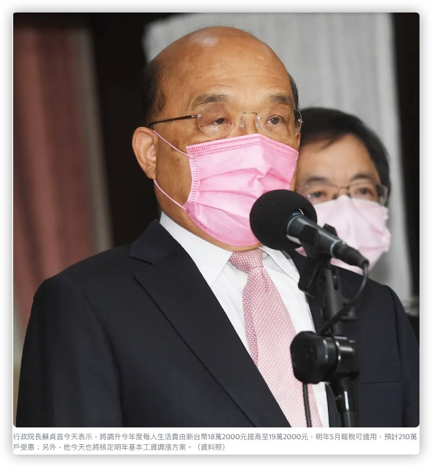 行政院長蘇貞昌今天表示,將調升今年度每人生活費由新台幣18萬2000元提高至19萬2000元,明年5月報稅可適用,預計210萬戶受惠;另外,他今天也將核定明年基本工資調漲方案。