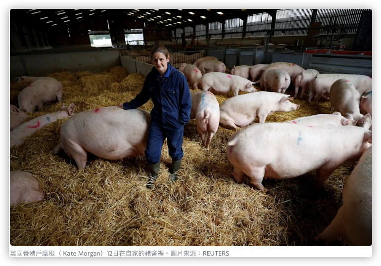 東部城鎮德里菲爾德(Driffield)附近的養豬戶摩根( Kate Morgan)與史考特(Vicky Scott)仍在拚命保留豬隻,摩根表示,「這種壓力前所未有...令人精疲力盡,經濟正在癱瘓中。」
