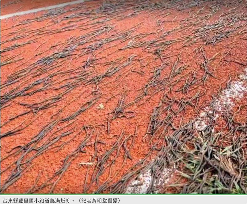 台東縣豐里國小操場跑道昨天出現大量蚯蚓,密密麻麻爬滿全部PU跑道,有的學生看到頭皮發麻。蚯蚓在歷經太陽曝曬後,多數被曬成蚯蚓乾。學校總務主任蘇俊榮表示,多數師生早已見怪不怪,藉此機會讓學童學習生命及環境教育課程,學習與大批蚯蚓共處。