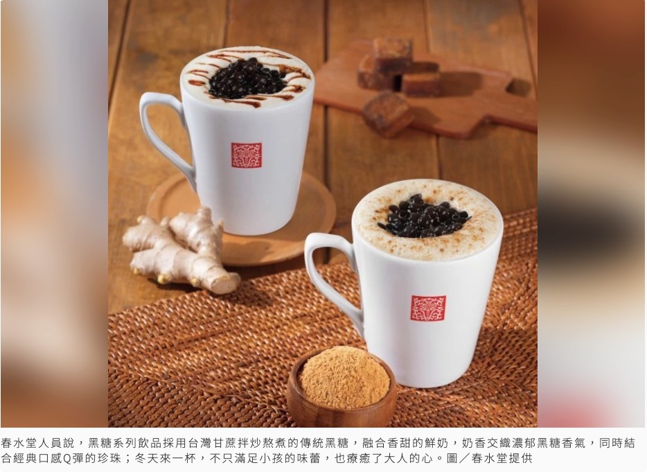 春水堂人員說,黑糖系列飲品採用台灣甘蔗拌炒熬煮的傳統黑糖,融合香甜的鮮奶,奶香交織濃郁黑糖香氣,同時結合經典口感Q彈的珍珠;冬天來一杯,不只滿足小孩的味蕾,也療癒了大人的心。