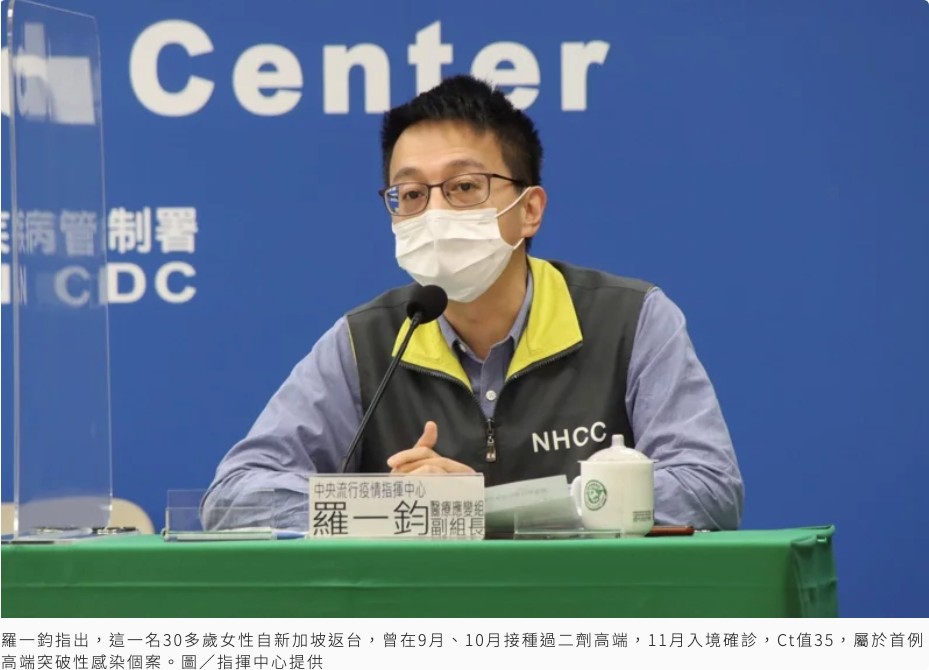 國內今日本土零案例,境外移入個案有9例,另外有6例屬於突破性感染個案,包含國內首例高端後出現突破性感染!中央疫情指揮中心醫療應變組副組長羅一鈞指出,這一名30多歲女性自新加坡返台,曾在9月、10月接種過二劑高端,11月入境確診,Ct值35,屬於首例高端突破性感染個案。