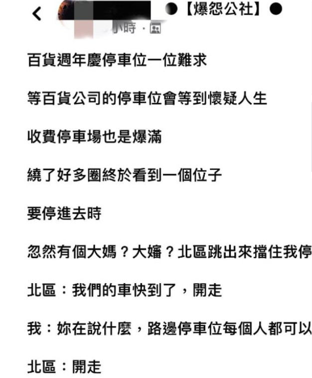 一名網友在爆怨公社發文,表示自己去百貨公司購物,那天恰好是百貨公司的周年慶,停車場可說是一位難求,就連收費停車場也是爆滿,她繞了好幾圈,終於發現一個車位,於是準備停車。