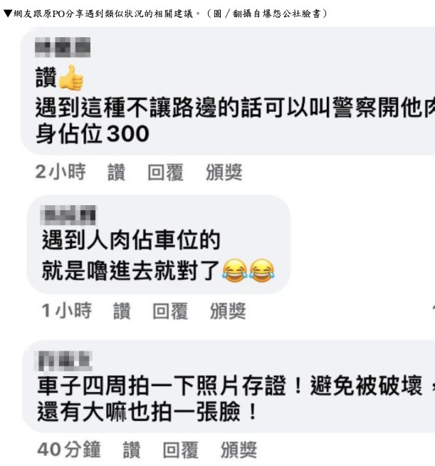 文章曝光後,引發網友熱烈討論,不少網友表示「遇到人肉佔車位的,就是嚕進去就對了」、「人肉佔車位真的很靠…北」、「但是要小心,車子是否有損毀」,其實原PO的作法假如稍有不慎,除了可能衍生額外的糾紛,更可能對人造成傷害,比較好的做法是向警察機關告發,請員警到場協助處理,保障自身權益。