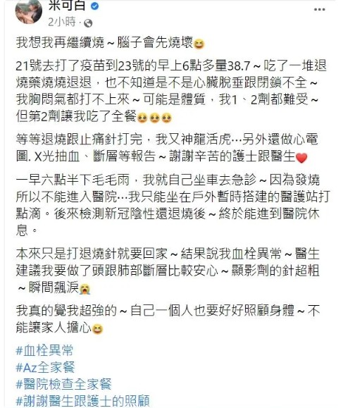 9月初接種完第一劑AZ疫苗的藝人米可白,21日早上10時左右施打第二劑,沒想到下午4時開始,強烈副作用來襲,全身腰酸背痛,整個人感覺忽冷忽熱,頭昏腦脹發高燒至38.5度,直到今(23)日上午症狀仍未緩解。米可白一早就獨自搭車赴醫院掛急診,還因為發燒不能進去,只好先在戶外打點滴,結果被診斷出血栓異常,要做更進一步的檢驗。