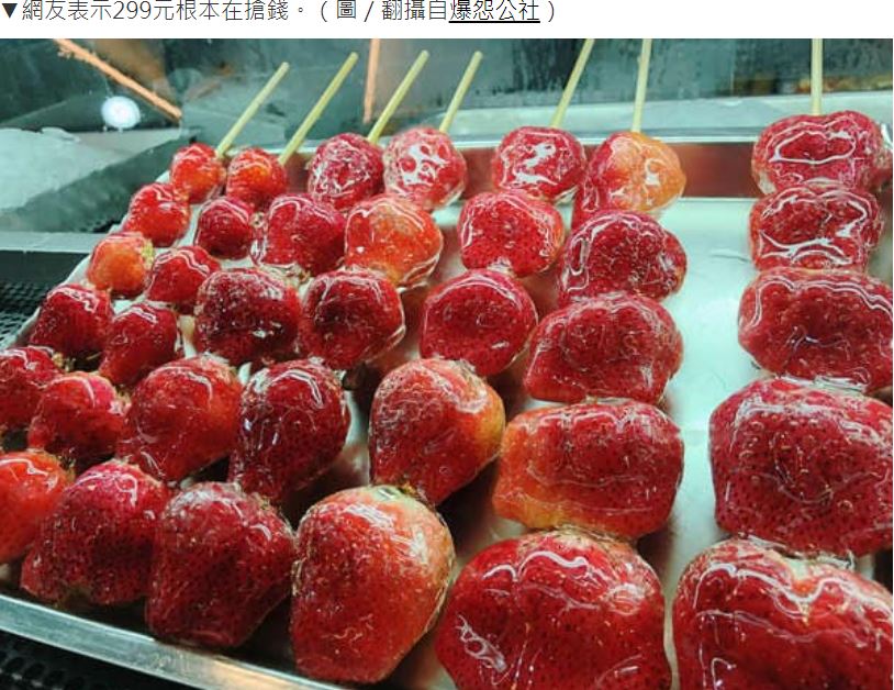 原PO在臉書社團《爆怨公社》發文表示,學弟難得到台中,就帶他到知名的逢甲夜市逛逛,期間看到糖葫蘆,就打算買幾支來吃。原PO表示他們共挑了3支,2支是番茄蜜餞,另一支是巨無霸草莓,結帳的時候,店員說巨無霸草莓1支299元,另外2支120元。