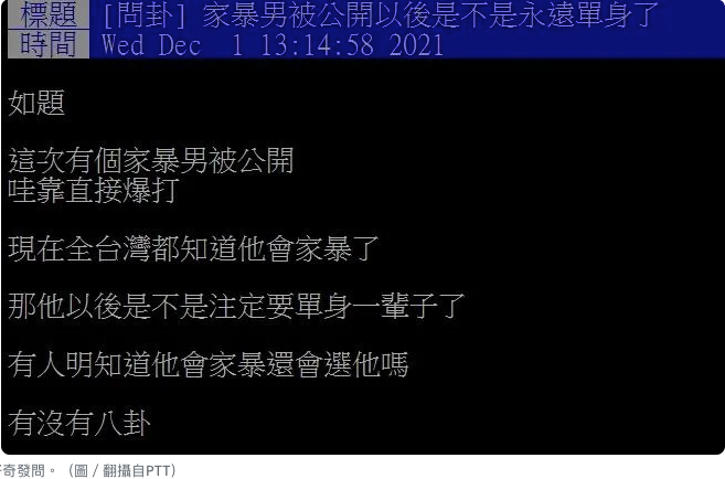 網友在PTT發文表示,林秉樞的暴力行徑被公開出來,受害者甚至不只高嘉瑜一人,他過去也曾對歷任女友做過相同事情,現在全台灣都知道他是會施暴的人,「那他以後是不是注定要單身一輩子了」,好奇會不會有人明知他可能會動手動腳,還選擇跟他在一起。