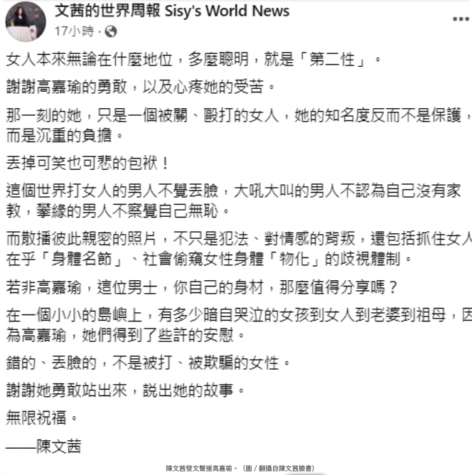 陳文茜昨(2)日在臉書發文表示,女人本來無論在什麼地位,多麼聰明,就是「第二性」,在感謝高嘉瑜的同時,她也心疼她的受苦,感嘆那一刻的她,只是一個被關、毆打的女人,「她的知名度反而不是保護,而是沉重的負擔。」 更多新聞:備份豆腐洩高嘉瑜私密照 專家點「使用大忌」注意另一半 接著陳文茜也砲火猛烈開酸林秉樞,「這個世界打女人的男人不覺丟臉」、「大吼大叫的男人不認為自己沒有家教」、「攀緣的男人不察覺自己無恥」,直指散播彼此親密的照片,不只是犯法、對情感的背叛,還包括利用女人在乎身體名節以及社會偷窺女性身體「物化」的歧視體制,氣憤表示「若非高嘉瑜,這位男士,你自己的身材,那麼值得分享嗎?」