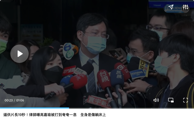 民進黨立委高嘉瑜遭友人林秉樞施暴案事發後,律師李永裕6日上午到新北地檢署遞送新的事證,包括11月12日林秉樞對高嘉瑜施暴後逼迫錄下的影片,內容是高受傷後,奄奄一息躺在床上,遭到林逼問,高回答「是」,若不回答即遭受暴力對待,證明所謂的「自白書」是受脅迫簽下。