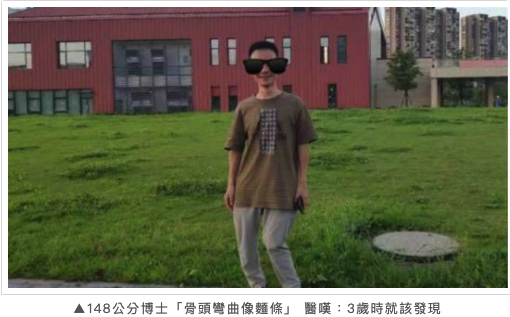 大陸浙江杭州有位39歲的李姓男子,身高不到150公分,但他積極面對,一路研讀到博士畢業,近日因腰痛到醫院看診,照X光後更發現全身骨頭嚴重變形,猶如彎曲的麵條。檢測基因發現他竟罹患罕病,醫生嘆:「3歲就該發現的」。
