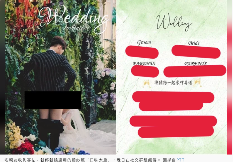 數月前不少婚宴受到疫情影響,新人紛紛延期甚至取消,直至防疫規定放寬才陸續回流決定舉辦。不過,有一名親友收到喜帖,新郎新娘選用的婚紗照卻尺度超大,近日在社交群組瘋傳,目前也被曝光到PTT,「口味太重」嚇壞眾網友。