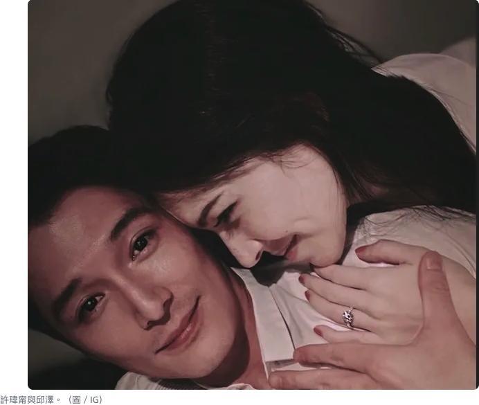 照片中兩人親密相摟,秀出對戒,許瑋甯手上的大鑽戒更是亮點。兩人因為合作賣座電影《當男人戀愛時》結緣,在結束拍攝後某次網友從許瑋甯分享的照片中發現,景色神似邱澤位在汐止家中的窗景,因而傳出熱戀,但兩人始終未對外鬆口承認關係。目前經紀人關機,尚未對外回應。