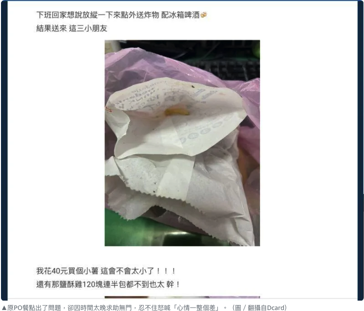 「這會不會太小了!」該名網友8日在Dcard中貼文,他表示下班回家後點了炸物外送,本想配冰箱啤酒放鬆一下,沒想到收到餐點時,裡頭要價40元的小薯,竟只剩一根超迷你的薯條,連120元的鹽酥雞都不到半包,但因時間太晚求助無門,令他怒喊:「心情一整個差,滿滿的髒話,有人有解決辦法嗎?」