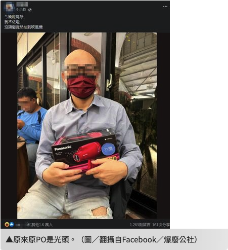 原PO昨(21)日在臉書社團「爆廢公社」發文表示,「今晚吃尾牙,我不依啦,沒頭髮竟然抽到吹風機」,並附上一張他和吹風機的合照,圖片中可見,原PO頭上沒有一根髮絲,獎品雖然好,但也是要「給對人」才能發揮作用。