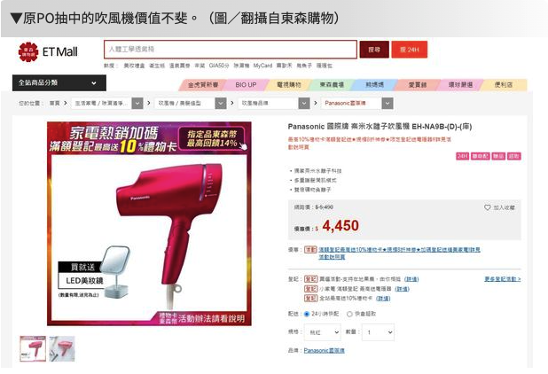 原PO抽到的六獎盒上可見,是國際牌Panasonic奈米水離子吹風機 EH-NA9B-RP,根據東森購物資訊,該型號吹風機原價5490元,特惠價也要4450元,頗有價值。