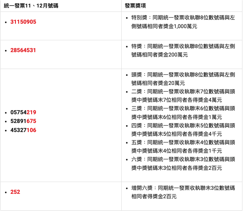 引用來源網址:https://tw.sports.yahoo.com/news/統-發票11-12月號碼開獎囉-開獎號碼請點此-040843784.html