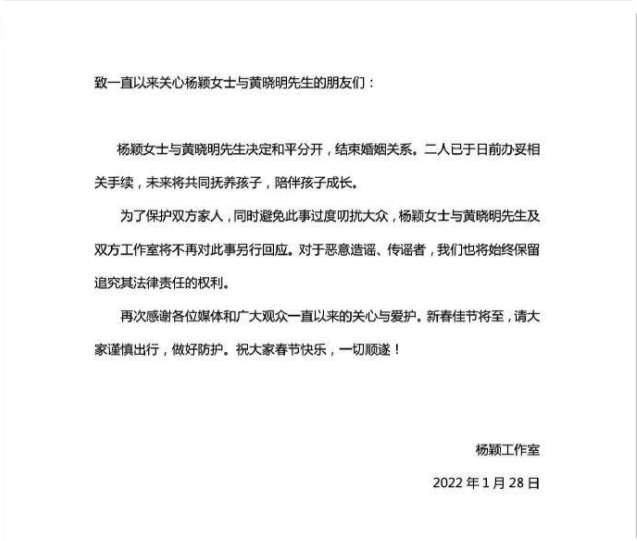 為了保護雙方家人,同時避免此事過度叨擾大眾,楊穎女士與黃曉明先生及雙方工作室將不再對此事另行回應對於惡意造謠、