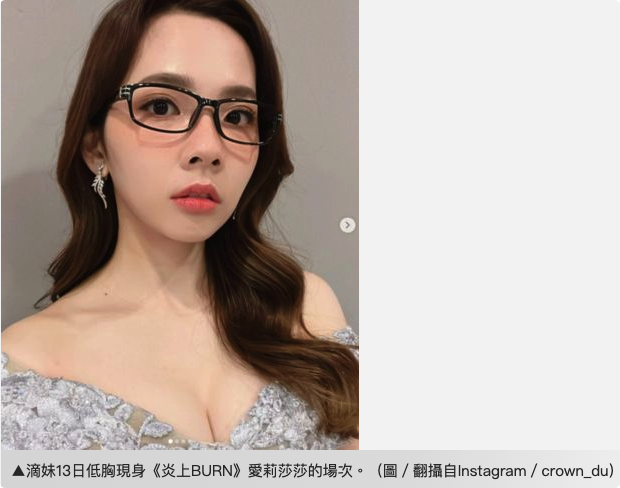 《炎上BURN》愛莉莎莎的場次2021年因疫情數度延期,13日好不容易能正式開演,現場聚集多位高知名度的YouTuber,滴妹也難得盛裝出席了,「有美嗎?」單穿低胸禮服的照片曝光後,圈內好友瑋瑋、董仔都忍不住浮出水面直誇:「美的!水噹噹!!」