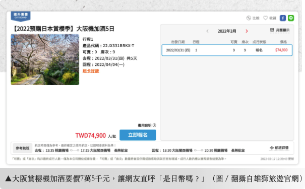 日本宣布3月起鬆綁邊境管制,外國人入境隔離縮短為3天,不過中央疫情指揮中心昨(17日)表示,會先開放商務旅行,目前尚未開放觀光團,後續之後再討論。不過,旅行社其實早已超前部署,和長榮航空談妥3月22日至6月28日飛日本7大城市的包機,以雄獅旅遊團費來說,最低就要56,900元起,甚至大阪賞櫻機加酒要到7萬5千元,比起疫情前,團費幾乎是翻倍,令不少網友直呼傻眼,還以為是日幣計價,更有人恨自己荷包太淺。
