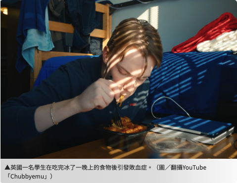 英國一名學生在吃完朋友前天從餐廳外帶回來剩下的雞肉麵條後,身體立刻出現不適症狀,之後更演變成敗血症必須截肢。