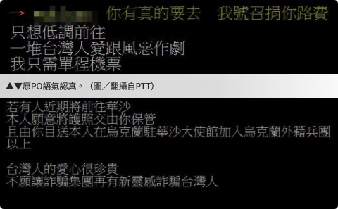 此外,也有網友詢問原PO是否真有要去?原PO回應,只要有鄉民贊助他,他就會去,而且他想低調前往,「我只需單程機票」;至於是否有相關經驗?他則說自己是一年役海潛退。由於仍有不少人覺得這只是玩笑話,因此原PO再次強調,若有善心人士最近剛好要前往華沙,可以帶他到大使館報名,「本人願意將護照交由你保管」。