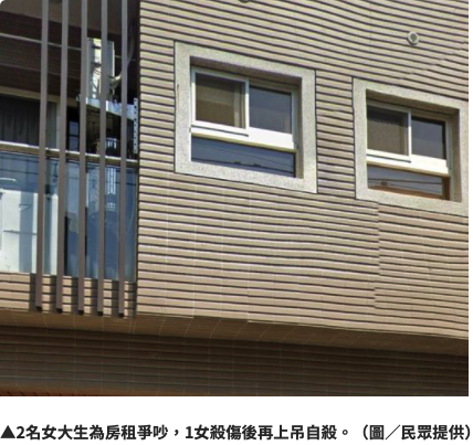 2名在逢甲商圈一起租屋的大二女學生,同住一間月租1萬2000元的套房,龔女今天凌晨向林女索討不到6000元房租,2人發生爭吵,龔女憤而拿水果刀劃傷林女,林女全身是傷,逃出屋門求救並報警,警方到場後發現,龔女已輕生,緊急送醫仍告不治,詳細案發原因仍由警方釐清中。