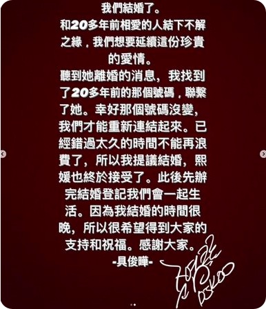 南韓跳舞偶像始祖團體「酷龍」前成員具俊曄8日在IG宣布結婚,對象是20年前舊愛大S,寫道:「我們結婚了。和20多年前相愛的人結下不解之緣,我們想要延續這份珍貴的愛情。聽到她離婚的消息,我找到了20多年前的那個號碼,聯繫了她。幸好那那個號碼沒變,我們才能重新連結起來。已經錯過太久的時間不能再浪費了,所以我提議結婚,熙媛也終於接受了。此後先辦完結婚登記我們會一起生活,因為我結婚的時間很晚,所以很希望得到大家的支持和祝福,感謝大家。」
