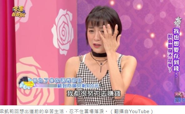 「國光女神」梁凱莉從《國光幫幫忙》出道,之後在《綜藝玩很大》中打出知名度,因呆萌的個性加上火辣的身材,受到不少粉絲喜愛。不過看似光鮮亮麗的她,日前在節目中透露,出道前其實經歷過一段相當辛苦的日子,當時一度窮到戶頭剩400塊,甚至只能睡在便利商店,回想起這段往事,讓她忍不住淚崩。