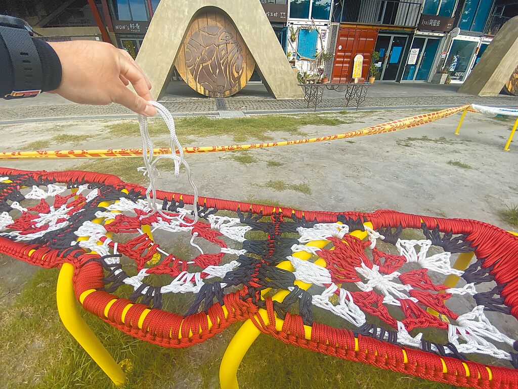 但展出不到10天,作品就慘遭破壞,民眾指出,不時看見孩子爬上椅子用力踩踏,使座椅編繩鬆脫,白色的特多龍繩也泥濘不堪,師生說,展出僅1周已前往補修2次,因這次繩子鬆脫恐有安全疑慮,才暫停使用。