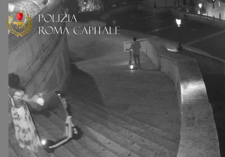 影片畫面顯示,一名據義大利當局指稱是美國28歲遊客的女性看似心情沮喪,一氣之下就把租來的電動滑車板從「西班牙階梯」扔下,滑板車往下滑行數階,隨後翻倒,撞到最新翻修過的石階。而與該名女子同行的29歲美國男子則是走在前方,牽著滑板車下階梯。
