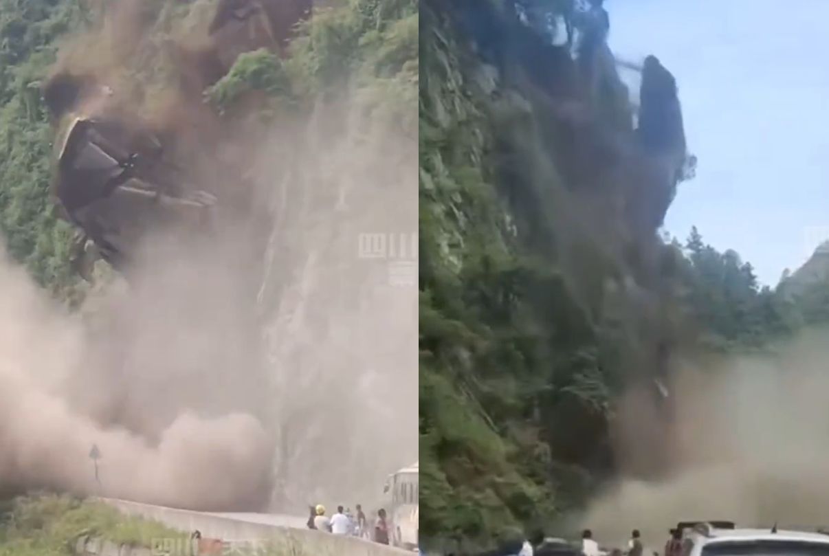 一段影片中共有3段民眾拍攝的畫面,受到瀘定地震影響,峨邊公路旁的山體突然崩落,大量塵土和巨石直接砸向路面,民眾紛紛逃開,站在遠處目睹災害發生的人則是發出驚呼。