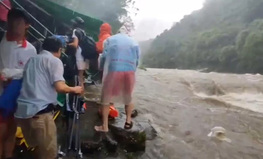 畫面中洶湧黃色溪水從上游滾滾而下,迅速漫淹河岸,冒雨烤肉民眾倉皇被疏散,但還是有人想折返搶收隨身物品被勸阻,錄影的人不斷高喊:「人命比較重要,東西不要了,太危險!」河水暴漲隨即沖走帳篷、烤肉架、桌椅等物,景象很驚人。
