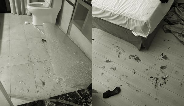 該人夫今凌晨在臉書社團「爆料公社」發文表示,浴室的玻璃門不知為何突然爆裂,老婆全裸在浴缸裡無法走出,他則全身都是玻璃,但仍忍痛爬到電話旁向飯店方求救,沿路都留下血跡。