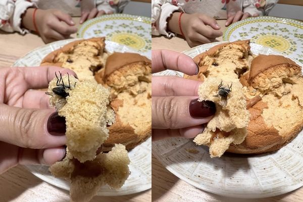 這名女子在「爆料公社」分享,她1月30日人在新竹高鐵站時,購買了某知名烘焙坊的布丁蛋糕,帶回家與2歲兒子、8歲女兒分享,豈料整個蛋糕吃了約一半,竟然在裡面發現一隻體型巨大的蒼蠅,光是肚子與腳露在外面,就讓人感覺相當噁心。