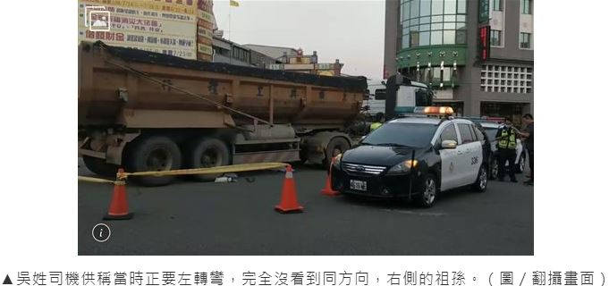 沒想到,祖孫2人行經自由路、建成路口時,遭吳姓司機駕駛的砂石車撞上,2人被捲入車輪底下,還遭拖行約14公尺,2人當場死亡,遺體殘破不堪。