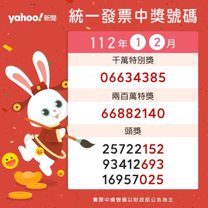 引用來源網址:https://tw.news.yahoo.com/快來對!統一發票112年1-2月中獎號碼出爐-044833634.html