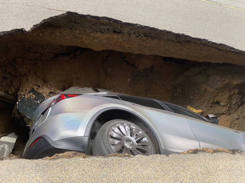 竹北市莊敬六街的坑洞,路面看起來大約一個車格大小,但是坑洞內部掏空約有兩個車格長、3公尺深。緊鄰坑洞的社區民眾表示,今天凌晨約5點有聽到一聲巨響,但是直到早上約9點半,民眾發現路旁有了這處坑洞。
