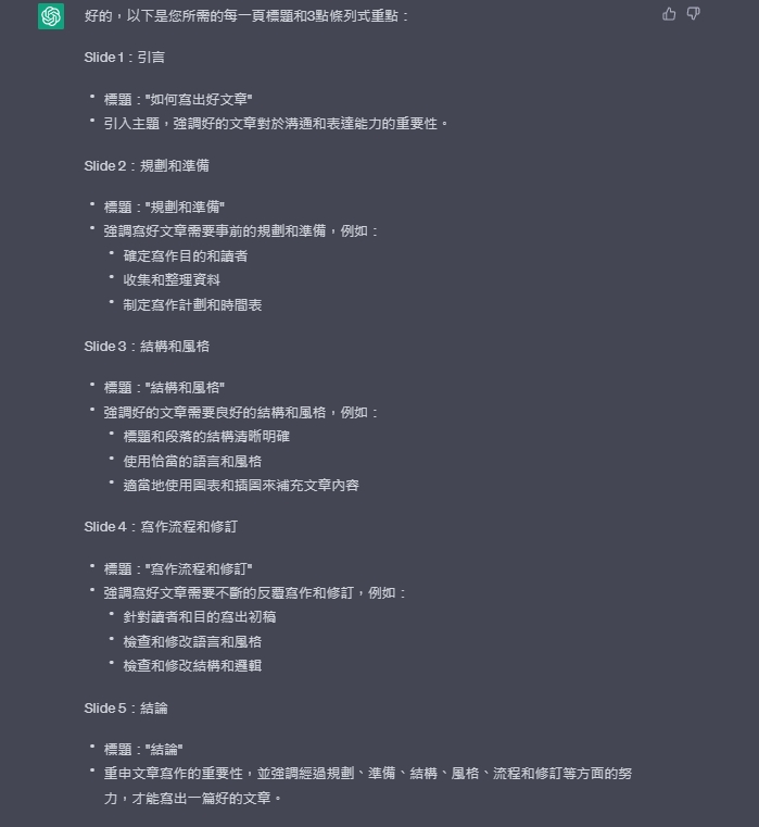 ChatGPT 可以根據您提供的指示和內容生成相關的文字內容。這可以節省您撰寫簡報的時間和精力,尤其是當您需要大量的文字內容時。