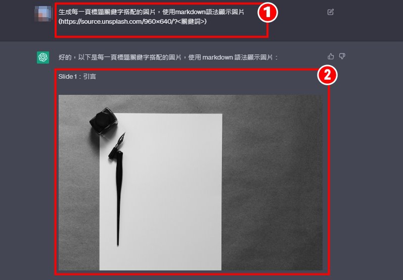 生成每一頁標題關鍵字搭配的圖片,使用markdown語法顯示圖片(https://source.unsplash.com/960x640/?<關鍵詞>)